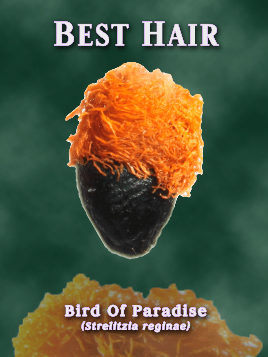 Just as alluring as the flower in bloom, the seed of the Bird of Paradise has a lovely set of flowing orange locks, or arils. While there are other seeds with nice “hair”—from the common reed’s silky fringe to the electric blue mane of the traveler’s palm—the Bird of Paradise seed’s bright shock of orange hair has an uncanny resemblance to what we see on humans.