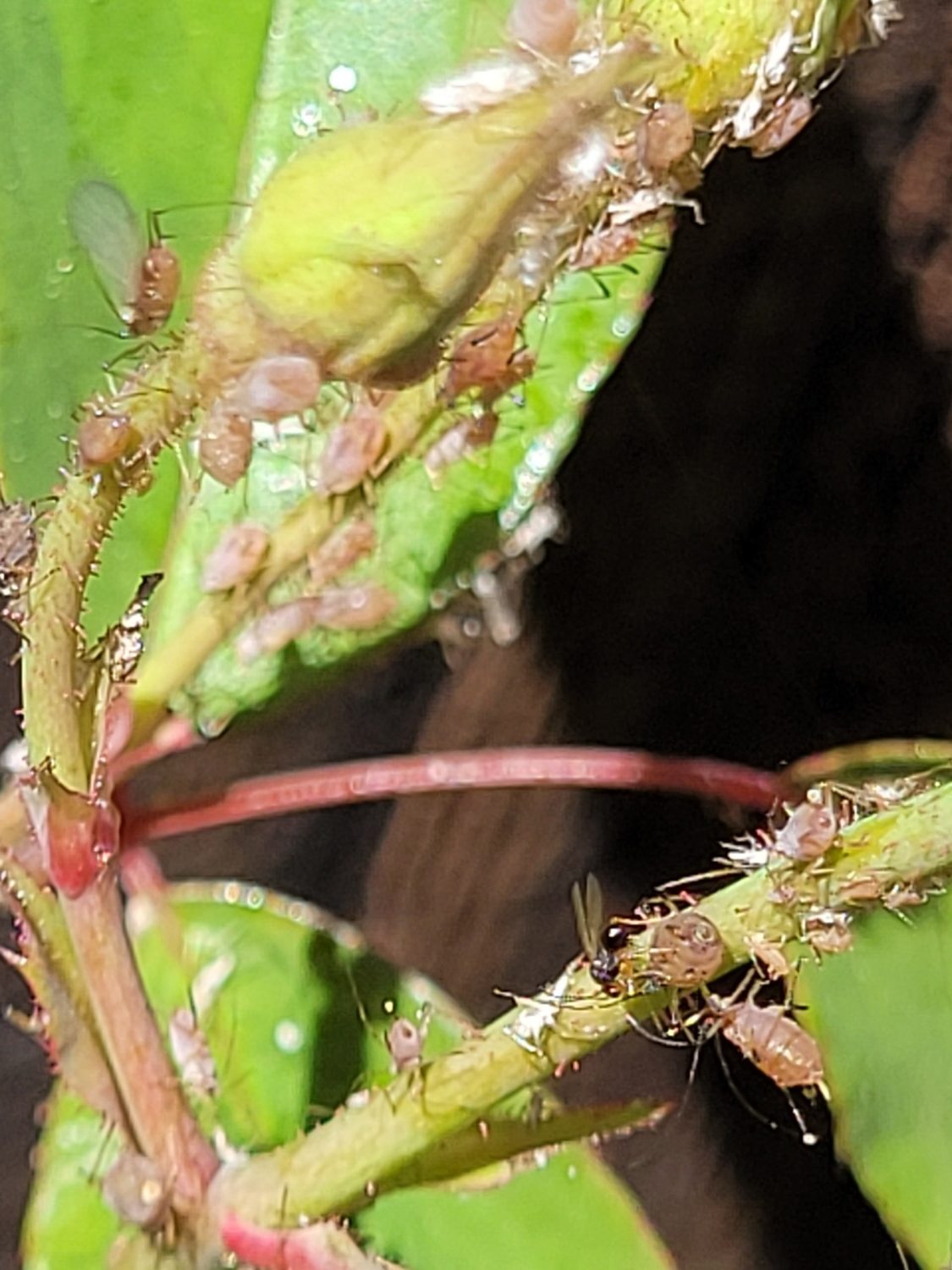 “I was the first woman to graduate in the Pest Management program at UC Berkeley in 1977. During my career, I helped raise and release natural enemies of insect pests as a way to reduce pesticide use. Now retired, I still find great joy in observing insects that visit my small garden. The bumble bees arrive first for the blueberry flowers, then honey bees, and syrphid flies. The lady bugs migrate on their own from the Sierras. I took this picture of a 50 year old Cecile Brunner rose covered with aphids. In the center is probably Aphidius sp. (Hymenoptera) laying an egg in an aphid. Free and safe biological control in action! I was delighted and so excited to see Aphidius at work! Check out the striped antennae!”