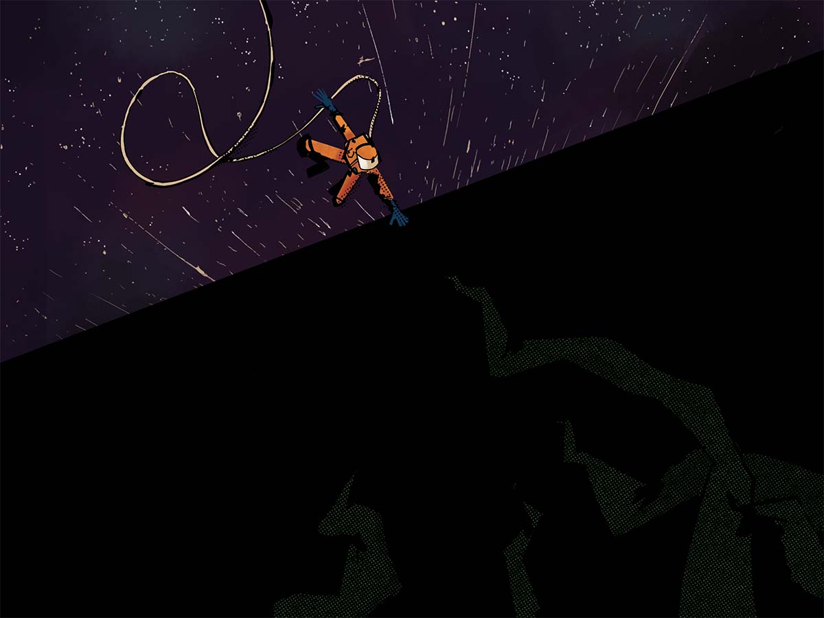 Artist Statement: My name is Mal Jones and I’m an illustrator and designer based in Alexandria, Virginia, just outside of Washington, D.C. I chose this quote because it really showcases Hawking’s ability to take physics concepts, and apply a metaphysical, dramatic, amazing, and a little scary take to them. My illustration takes Hawking’s dramatic tone and filters it through 1950s science fiction. I’m playing with color, shape, and contrast to mirror Dante’s use of language to create metaphor. Plus, who really knows what’s lurking in the infinite blackness beyond an event horizon?