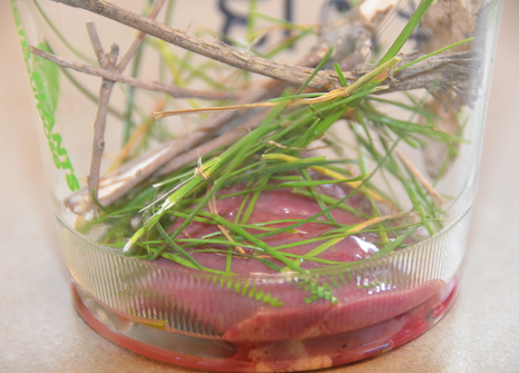 It is okay to gently move any plant material or soil using forceps or plastic utensils to check the surface of the meat, and then return the covering. If you wrapped the meat in plastic or fabric, leave the meat wrapped and only observe insects outside the wrapping.