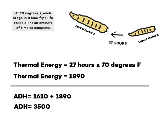 The total amount of thermal energy that an insect requires to reach a given stage of its life cycle is referred to as the accumulated degree hour (ADH). Scientists have determined ADH values for many species of fly that can be found on corpses.