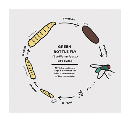 The green bottle fly is found in most tropical and temperate regions around the world, and it’s often one of the first insects to arrive at a corpse. Scientists have studied the life cycle of green bottle flies and have a good understanding of how environmental variables like temperature affect its rate of development.