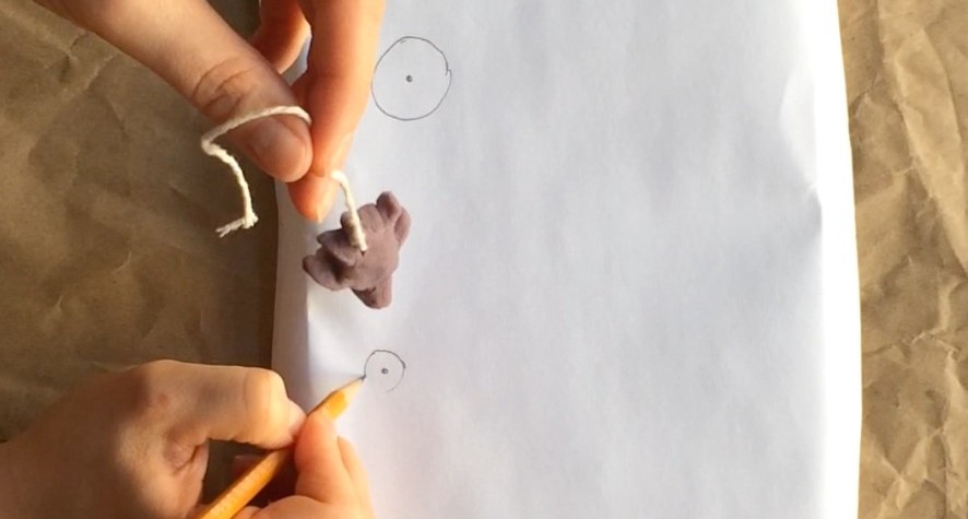 - Press a small amount of modeling clay or play dough onto your bolt, pulling the string so that it comes out of the top. Carefully sculpt a turtle out of the clay, making sure to keep the bolt on the bottom and the string on the top. Test your turtle to make sure that it hangs easily when you hold it by the string, and adjust as needed. It should look like this when you’re done: