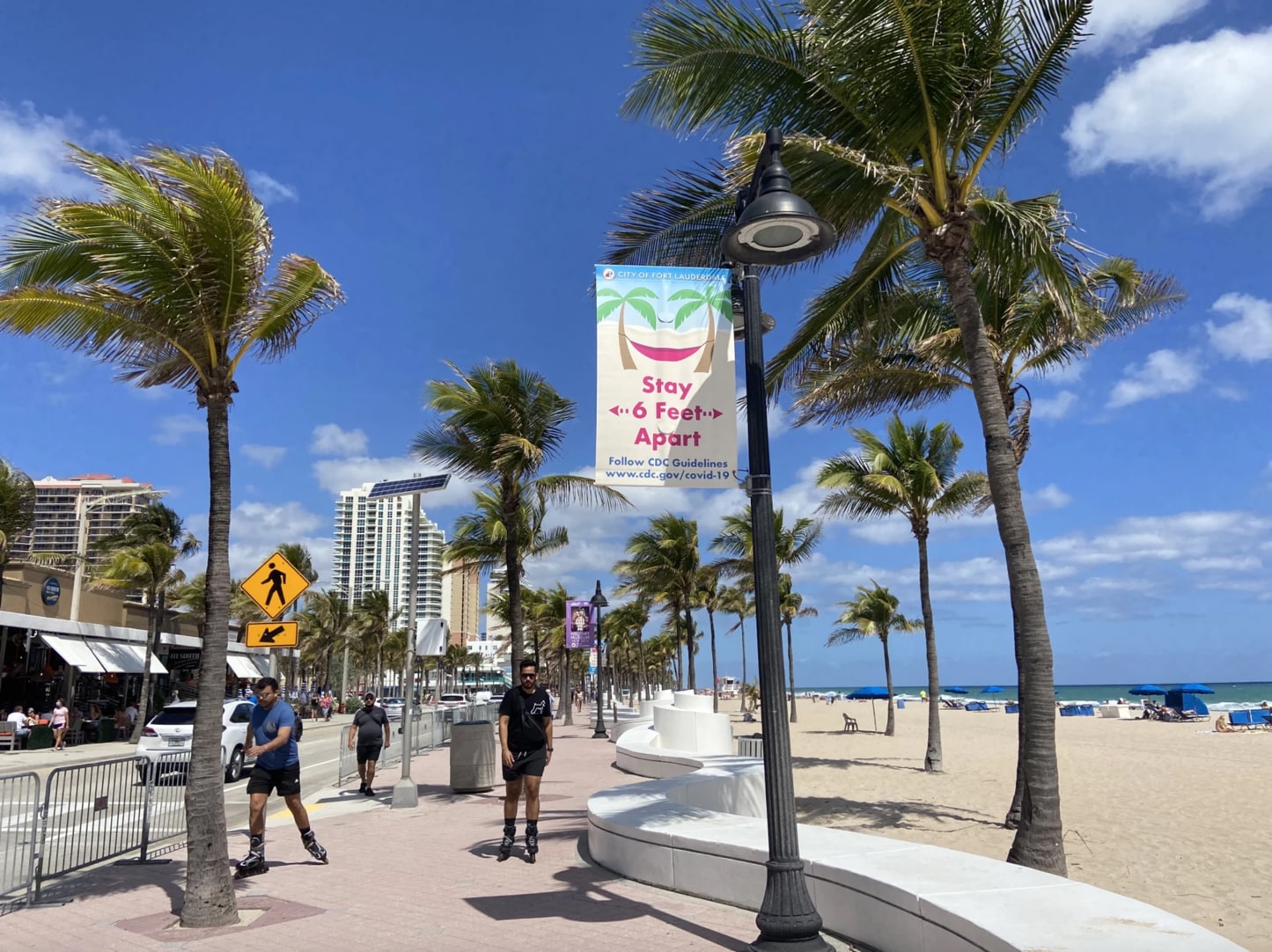 a daytime shot of the fort lauderdale boardwalk with palm trees and people rollerblading. a sign hangs from a lamppost saying 'stay 6 feet apart, follow cdc guidelines'